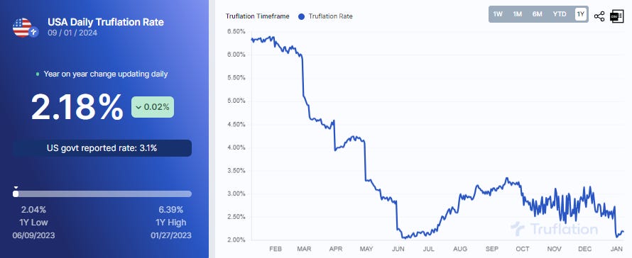 Since peaking at 3.4% in September, Truflation has hovered between 2.5% - 3.0% during Q4 ‘23, before plummeting in the new year to a current reading of 2.18%.