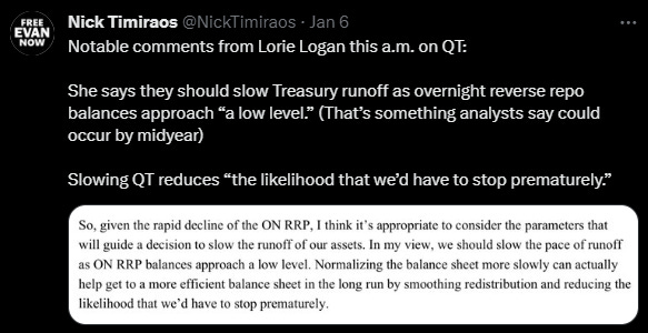 Indeed, the Fed is already floating the trial balloon of bringing an end to QT as the RRP gets low. From Nick Timiraos, courtesy of Le Shrub: