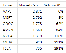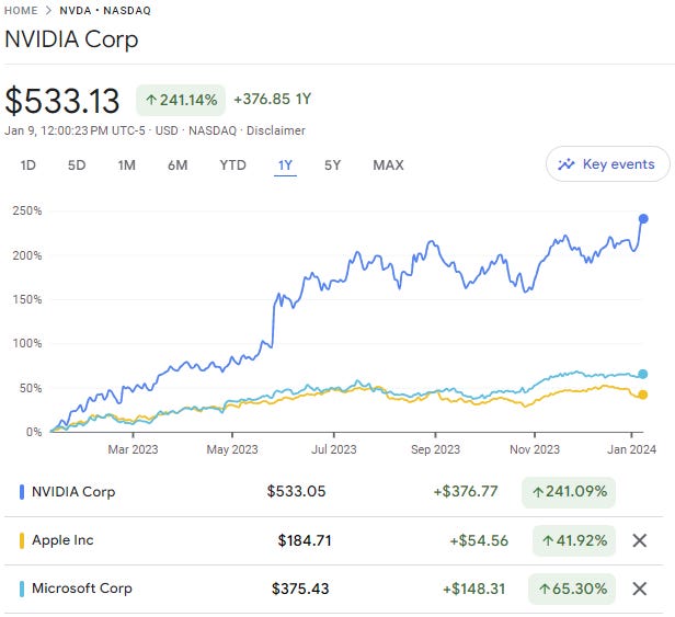 So NVDA needs to close the gap on AAPL (and MSFT) by ~118%. A stretch, but seemingly achievable if you just consider what the stock did in 2023, when it outperformed AAPL by 200% and MSFT by 175%: