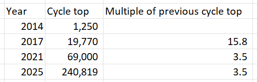 Why $100k and $250k? Well, the 2021 peak was 2.5x the 2017 peak, 2.5x the 2021 peak gets us close to $250k, and $100k feels like a reasonable one year target along the way: