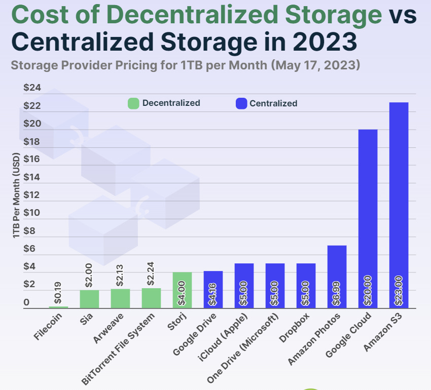 Filecoin ($FIL: disclosure long) is a decentralized data storage and retrieval network. Think of it as a decentralized competitor to the centralized cloud storage solutions like Dropbox or Google Cloud. As year end 2023 it has 9 EiB1 in storage capacity and 1.8 EiB in utilization. It’s already a cheaper option than centralized cloud storage.