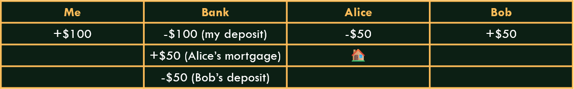 Notice how in the above example we start with $100 in the economy (your deposit) but end with $150 in the economy (your deposit plus Bob’s deposit). $50 was created by the bank's lending activity. In a credit money system, like our global fiat financial system, banks have the ability to effectively create new money by extending credit.