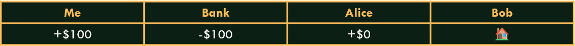 What if in the meantime, however, your bank decides to lend a portion of your money out to Alice, to buy a house from Bob, and Bob deposits the proceeds from the sale of his house into his checking account at the bank?