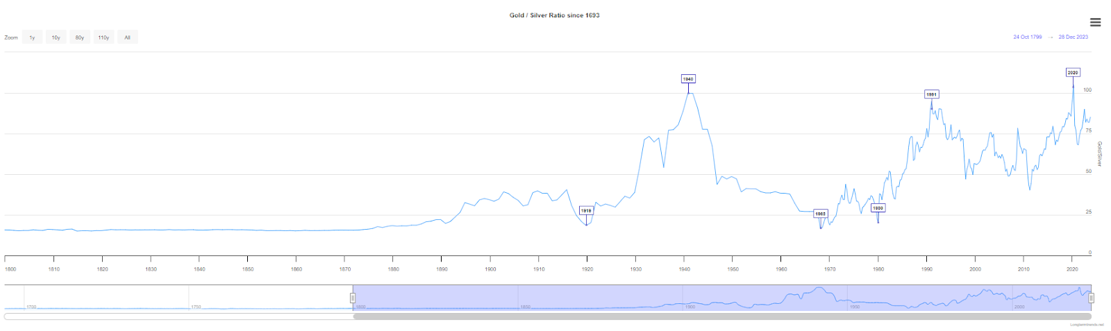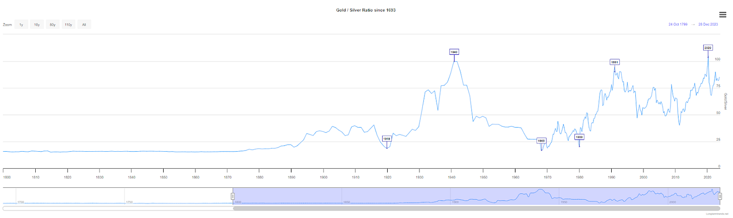 Over long periods of time, though, gold has held its value much better than silver, as indicated by the long-term chart of the gold/silver ratio, which measures how many ounces of silver are needed to purchase one ounce of gold: