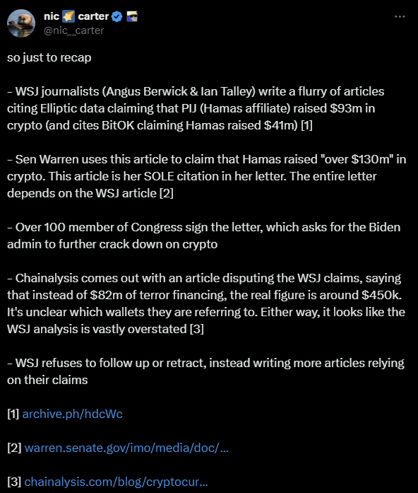 Senator Warren is using false reporting from the WSJ that Hamas has raised substantial sums in crypto to fund their terrorist activities, and calling for a further crackdown on the industry based on such claims. Over 100 members of congress have signed the letter.