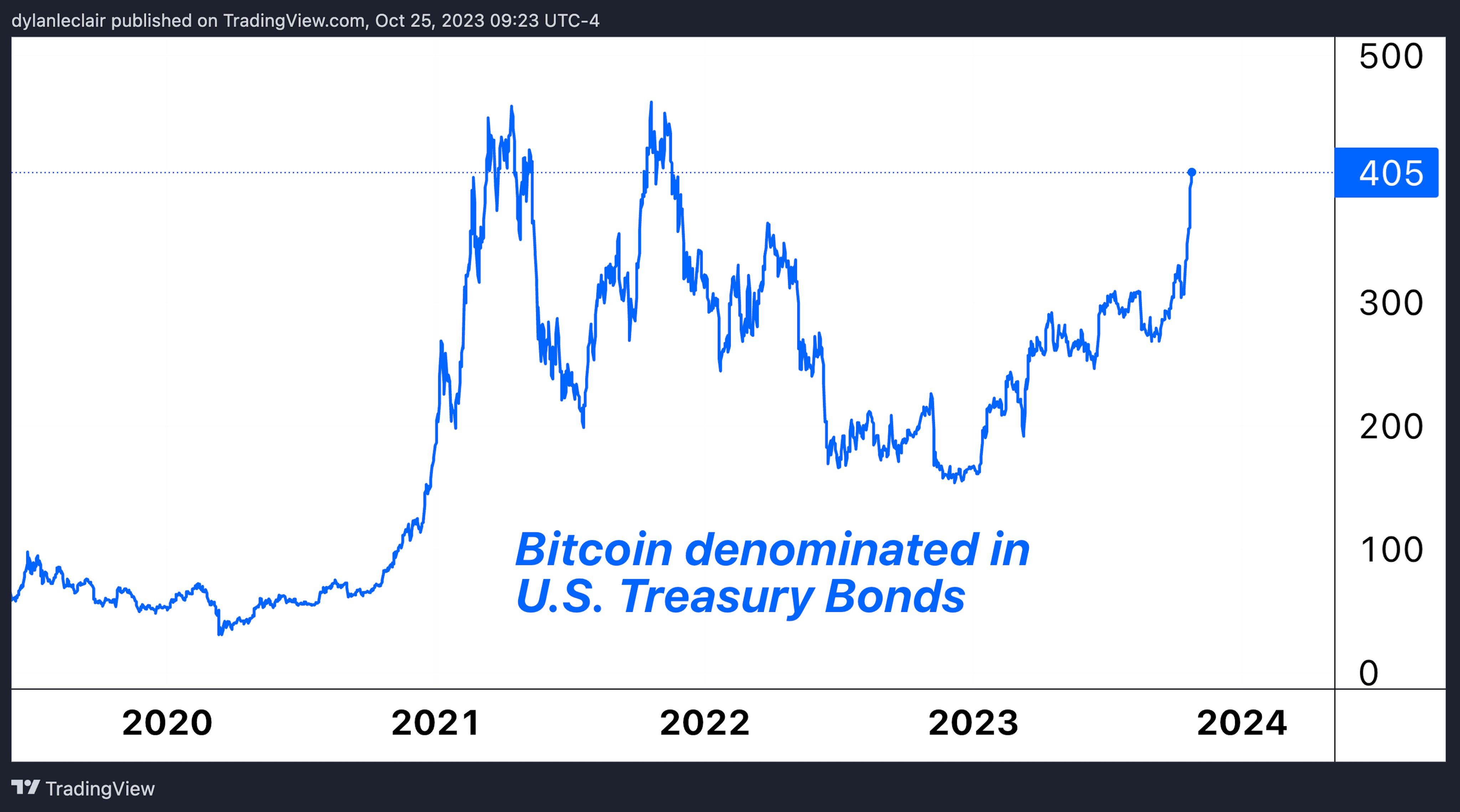 Denominated in US treasury bonds, bitcoin is surging toward all-time highs:
