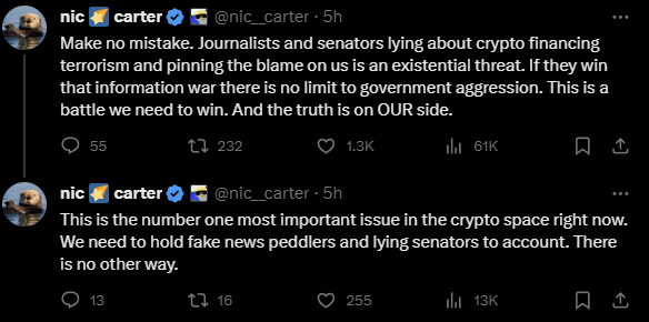 As Nic Carter conveys, this is existential, and it is imperative that the truth is brought to light and the public does not swallow the “terrorism financing” crypto narrative.