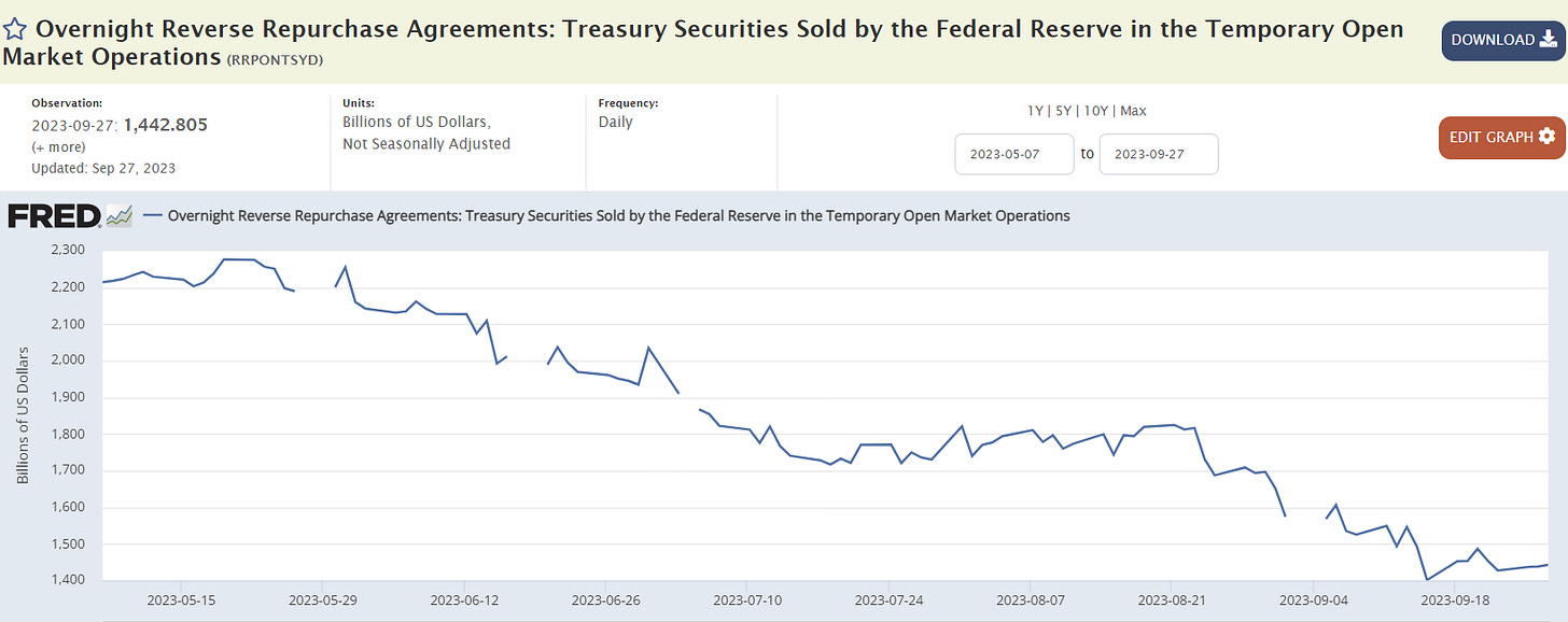 That’s about a $800 billion drawdown in the ON RRP, which nearly matches the $1 trillion combined liquidity draw from the TGA and the Fed balance sheet over the same period.