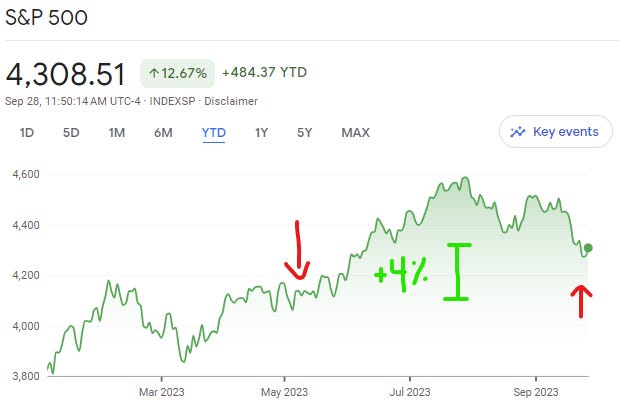 I thought I had a compelling thesis for why stocks were due for a drawdown back in May, and here we are with the S&P up 4% and the Nasdaq up about 11% from May 7 to Septmeber 28 close. I latched onto the TGA rebuild narrative, but missed that it would be funded by the repo markets and be a net neutral event to overall market liquidity.