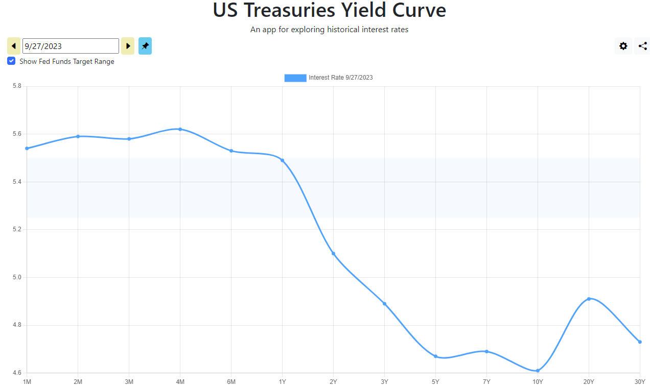 Well, over the past four months that’s exactly what’s happened. The Treasury has decided to primarily tap money markets and the reverse repo to refill the TGA by issuing bills, and so far has been reluctant to borrow at the medium- and long-end of the curve despite the fact that it costs them more to borrow short-term (currently ~5.6%) than medium- or long-term (currently ~4.75%). This is the “inverted yield curve” you keep hearing about:
