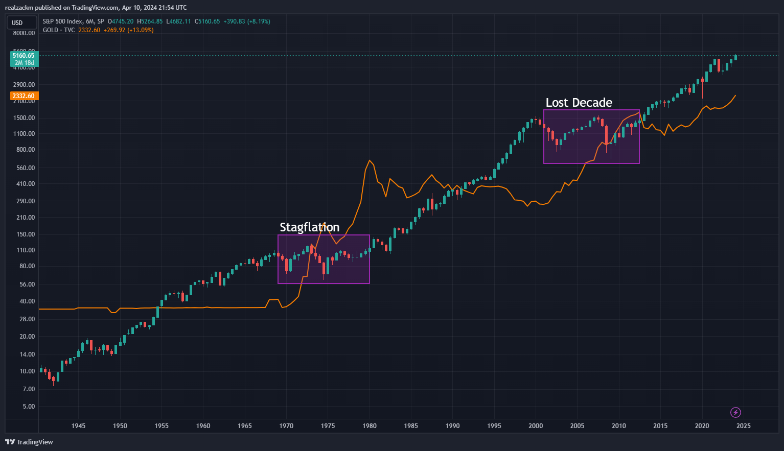 Since Nixon left the gold standard in 1971, there have been two market regimes where gold has outperformed the S&P 500 over a rolling 5-year period: 1972-82 and 2002-12.
