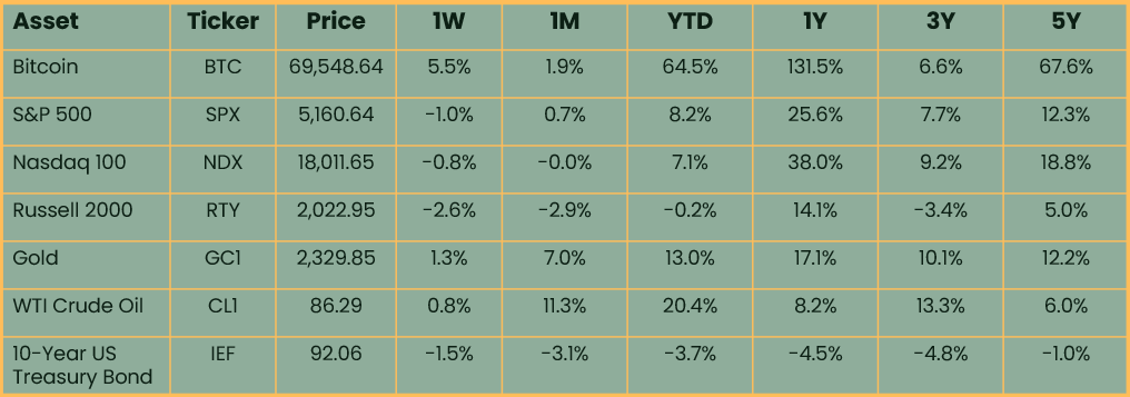 Hard assets bitcoin, gold and crude rallied on the week while stocks and bonds fell. Bitcoin was the best performer, staging an impressive rally on Wednesday after initially falling in reaction to a hotter-than expected CPI print which weighed on all assets. CPI was a reported 3.4% year over year vs. expected 3.3%, stoking fears of a rebound in inflation and contributing to the weekly decline in stock indices. Gold gave back some recent gains but still sits near new all-time highs and held on to a 1.3% gain for the week. As mentioned, gold has now performed in-line with the S&P 500 over a 5-year period for the first time since 2012. Bonds sold off as the 10-year US treasury yield rose back above 4.5%.