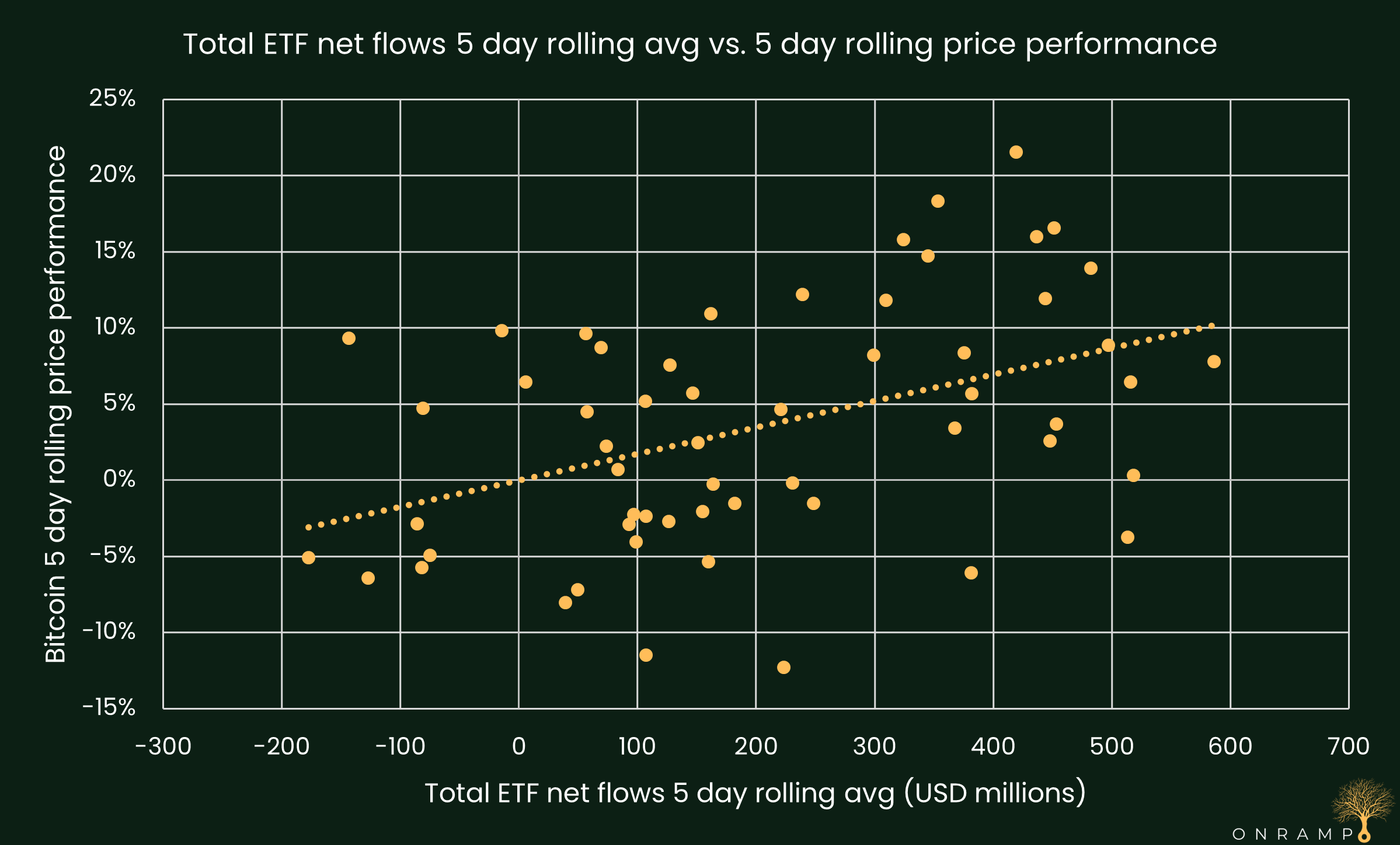 We took a look at the correlation between 5 day rolling average ETF flows and 5 day rolling bitcoin price performance: